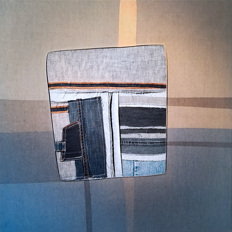 Ce sont les vieux jeans usés de mon père qui sont à l’origine de cette série. Patinés par le temps, ils offrent une riche palette de bleus. (Je vous renvoie aux très intéressants travaux de Michel Pastoureau sur la couleur et l’histoire du jean). La technique du rapiéçage est utilisée pour les intégrer à la toile de lin sur le châssis 80 x 80cm.