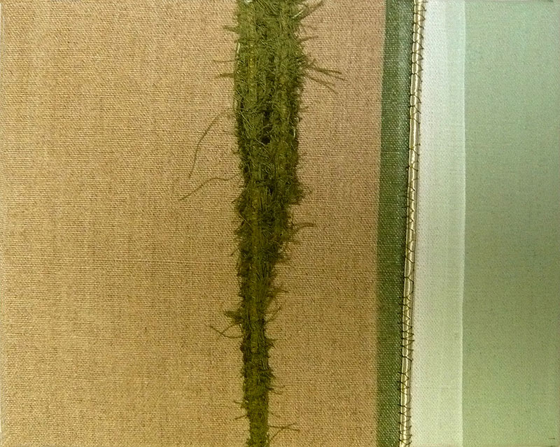 Ce sont des petits formats (20x20 cm). Acrylique sur toile et fils. Il y a de la couture et de la passementerie. C’est en réalisant ce travail que j’ai compris ce qu’était le velours.